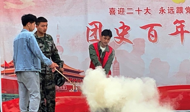 培训结束后,紧接着进行了全校2022年地震消防应急疏散演练:随着一阵尖锐而急促的警报声响起,全校师生、教官按照预定预案紧张有序地从教室向操场撤退,各班清点人数。得知有一名同学受伤,医护人员迅速为受伤人员清理包扎伤口。演练最后,熊教官及校内教官指导同学们实地体验使用灭火器灭火。整个活动安全有序,圆满成功。