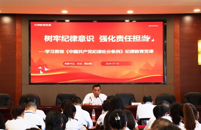 为深入开展党纪学习教育,进一步引导学校党员干部学纪、知纪、明纪、守纪,7月1日,我校党委书记、校长周志明以《树牢纪律意识,强化责任担当》为题为全体党员、助理及以上管理人员讲授党纪学习教育专题党课。