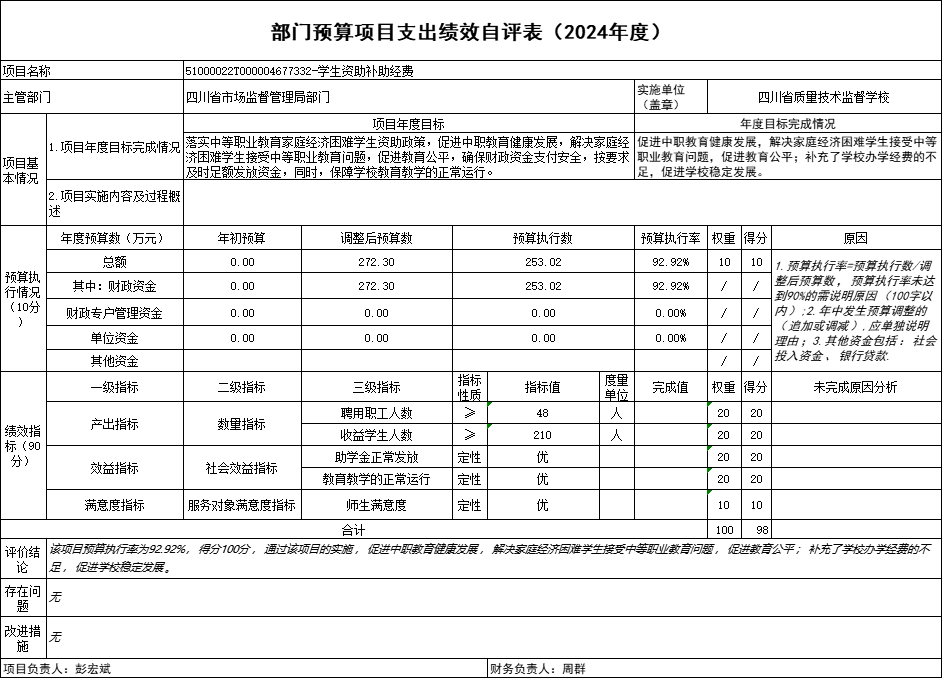组织对2024年度一般公共预算全面开展绩效自评,形成四川省质量技术监督学校单位整体(含单位预算项目)绩效自评报告 ,四川省质量技术监督学校单位整体(含单位预算项目)绩效自评得分为97.08分,绩效自评综述:2024年度,我校紧紧围绕省委省政府、省市场监管局的决策部署和学校发展规划,以提升教育质量为核心,以预算绩效管理为抓手,严格执行预算,优化资源配置,各项事业取得显著成效,基本完成了年度绩效目标,预算执行情况良好,资金使用效益显著,有效保障了学校教育教学、人才培养和社会服务等各项职能的履行。绩效自评报告详见附件。(注:如不涉及,可根据实际修改表述。)